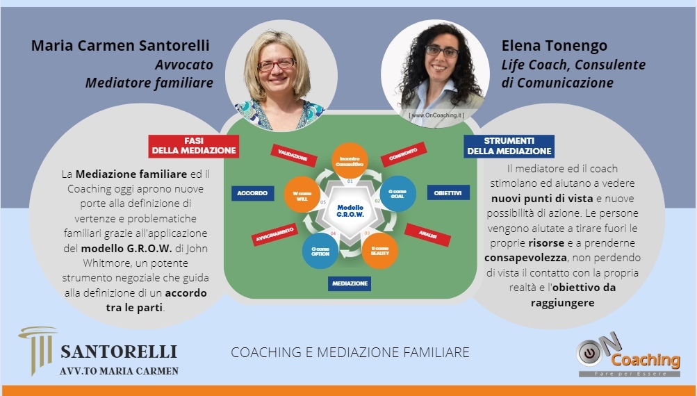La Mediazione familiare ed il Coaching oggi aprono nuove porte alla definizione di vertenze e problematiche familiari grazie all’applicazione del modello G.R.O.W.di John Whitmore, un potente strumento negoziale che guida facilmente alla definizione di un accordo tra le parti.